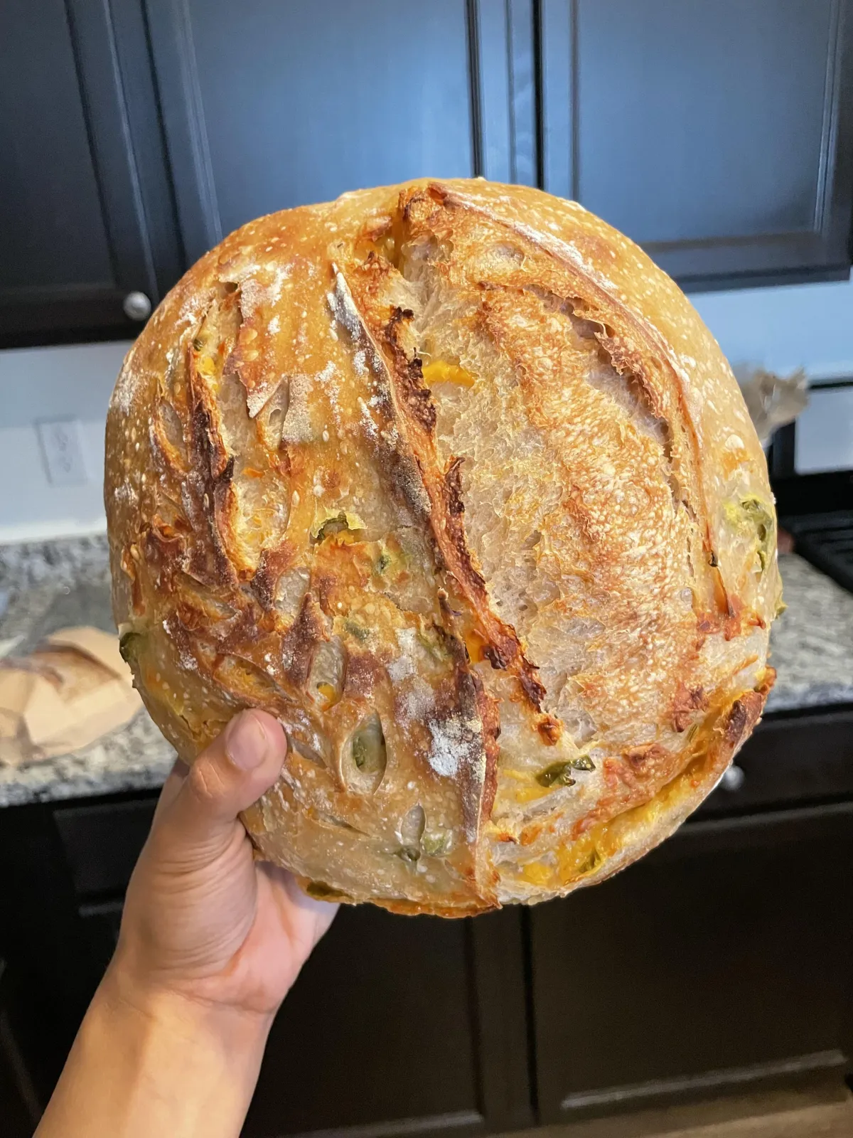 Our savory loaf crafted with organic all-purpose flour and naturally fermented leaven, packed with sharp cheddar and fresh jalapeños, finished with a touch of salt for bold, balanced flavor.